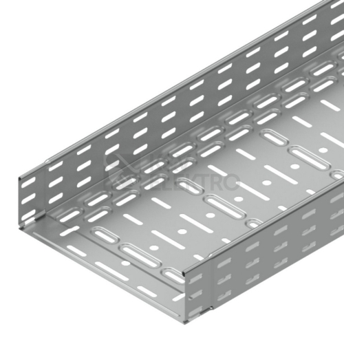 Kabelový žlab s integrovanou spojkou KZI 85x300 z plechu tloušťky 1,00 mm v povrchové úpravě sendzimir, děrovaný, opatřený embosy pro zvýšení pevnosti a tuhosti.