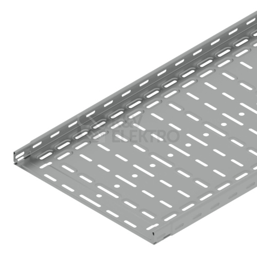 Kabelový žlab s integrovanou spojkou KZI 35x400 z plechu tloušťky 1,00 mm v povrchové úpravě sendzimir, děrovaný, opatřený embosy pro zvýšení pevnosti a tuhosti.