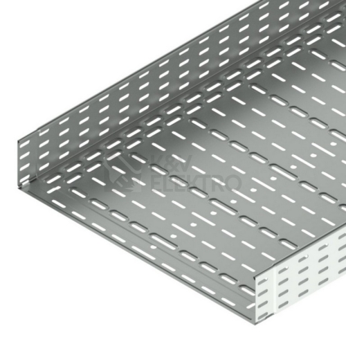 Kabelový žlab s integrovanou spojkou KZI 110x600 z plechu tloušťky 1,25 mm v povrchové úpravě sendzimir, děrovaný, opatřený embosy pro zvýšení pevnosti a tuhosti.