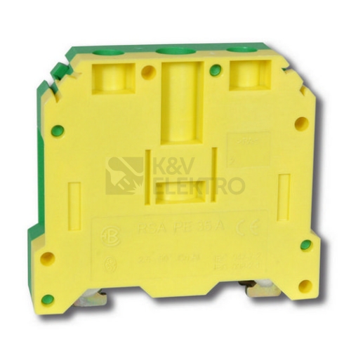 Tyto výrobky jsou určeny ke spojování ochranných vodičů v soustavách TN-C, TN-S. Jsou konstrukčně řešeny s vodivým spojením ochranného vodiče na nosnou lištu TS 35x7,5 a TS 35x15 ocelovou, galvanicky upravenou ZnCr. Vodivé spojení je spolehlivě zajištěno kontaktem při dodržení pokynu k montáži,dodávaného s výrobkem. Všechny typy svornic RSA PE jsou obrysově (délka a výška) totožné se základními typy svornic RSA. Konstrukční provedení U těchto typů řadových svornic je konstrukční provedení obdobné jako u základních svornic RSA. Izolační pouzdro se však odlišně od základních typů skládá ze dvou barevných částí, zelené a žluté, čímž je dosaženo zelenožlutého barevného provedení. Svornice je takto i oboustranně zapouzdřena. Soudržnost obou částí svornice zajišťují čepy, eventuelně u inovaných typů speciální západky. Vodivé spojení na lištu Vodivé spojení na lištu DIN je zajištěno čelisťovým kontaktem, jehož dotažení se provádí středovým šroubem umístěným mezi krajními šrouby pro dotažení vodiče. Nosné lišty lze využít jako sběrnice pro funkci PEN pouze tehdy, je-li materiál lišty Cu a průřez Cu vodiče 10 mm2 a vyšší. Ocelová lišta, galvanicky pozinkovaná a pasivovaná chromátem může být použita pouze pro funkci PE.
