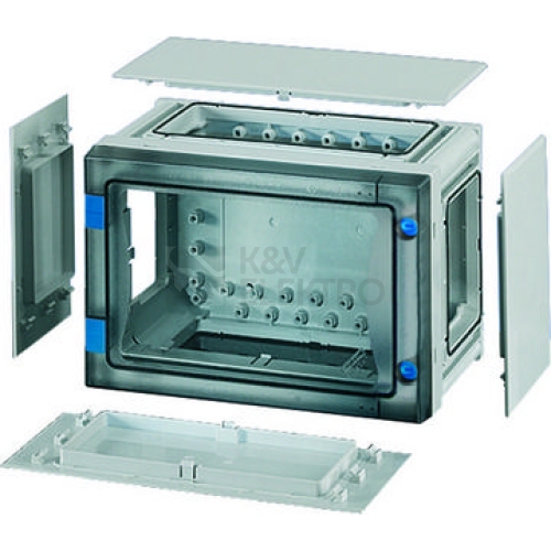 Skříň s dvířky pro montáž instalačních rozváděčů do 250 A pro ovládání běžnými osobami v souladu s normou IEC 61439-3. Otevřené stěny skříně pro kombinaci nebo jako samostatné skříně s krycími deskami. Z vysoce kvalitního polykarbonátu s ochrannou izolací. Rychlé spojení skříní pomocí konektorů a integrovaných těsnění. Stěnové průchodky s velkými otvory pro elektrické připojení skříní. Kabelové vývodky přes příruby. Upevnění na stěnu přímo na skříni pomocí vnějších úchytek nebo pomocí montážních lišt. Prázdná skříň s průhlednými dvířky a dveřním uzávěrem s ovládáním nástrojem a se sadou krycích desek. Pro montáž přístrojů na montážní desku nebo na nosnou lištu DIN. Montážní rozměry š 216 x v 126 x h 140 mm. Max. vestavná hloubka při zabudované montážní desce 136 mm, při zabudované nosné liště 125 mm. Plombovací sada pro plombování dveří se musí objednat samostatně.