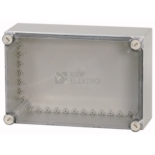 Skříňka s průhledným víkem, material: Polykarbonát, odolná proti nárazům, stupeň krytí IP65, volitelně uzamykatelná s DVZ...-CI, pat entované upevňovací šrouby víka s integrovaným vyrovnáním přetlaku, bočnice hladké, bez vylamovacích otvorů, upevňovací oka k upevnění na stěnu, upevňovací šrouby s možností plombování, RAL 7032, štěrkově šedá (dolní část skříňky), průhledná, bezbarvá (víko), vestavná hloubka s montážním plechem=125 mm, provedení krytu: průhledné, provedení dolní části: hladké