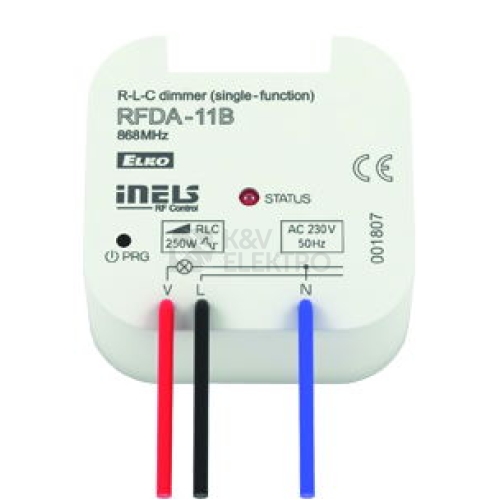 RFDA-11B | Stmívací aktor Nová řada RF&OASIS Compatible není kompatibilní s původními prvky RF (verze _st) !! radiofrekvenčně ovládaný stmívač určený pro vytváření světelných scén, ovládání jednoho nebo skupiny světel RFDA-11B: základní - 1 světelná scéna , funkce OFF jeden stmívací aktor může být ovládán až 8-mi ovladači umožňuje stmívání žárovek a halogenových svítidel s elektronickým nebo vinutým transformátorem R,L,C (zátěž se nesmí kombinovat) s maximálním příkonem 250 VA ochrana proti překročení teploty uvnitř přístroje - vypne výstup elektronická nadproudová ochrana - vypne výstup při přetížení a zkratu nouzové ovládání tlačítkem Prog. signalizace stavu přístroje LED diodou na předním panelu pracovní frekvence 868 MHz v provedení do instalační krabice (např. KU68) Technické parametry Napájecí napětí: 230 V AC Příkon ztrátový: 0.83 W Tolerance napájecího napětí: +10 -15 % Připojení: 3-vodičové, s “NULOU“ Nouzové ovládání: PROG (ON/OFF) Dosah na volném prostranství až: 160 m Pracovní teplota: 0.. +50 0 Upevnění: volné na přívodních vodičích Krytí: IP 30 Rozměr: 49x49x21 mm Hmotnost: 40 g