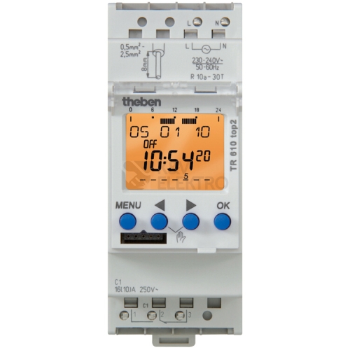 THEBEN TERMINA TR 610 top2 kód 6100105 segmentové digitální spínací hodiny pro montáž do rozvaděče na profilovou lištu 35 mm (DIN EN 50 022). 1 kanál s 56 paměťovými místy, EEPROM Denní a týdenní program Obsluha 4 tlačítky Integrovaný čítač provozních hodin s možností zpětného nastavení a servisní funkcí, která zobrazením indikace „Service“ na displeji, odděleně pro každý kanál, upozorňuje na intervaly údržby Bezšroubové svorky vždy pro 2 vodiče (drát nebo lanko) Osvětlení displeje (vypínatelné) Rozhraní pro zásuvnou paměťovou kartu OBELISK top2 umožňuje programování na počítači, použití 2. programu, kopírování a zálohování programů Prázdninový program řízený datem Automatické přepínání letního a zimního času lze vypnout nebo volně naprogramovat (volitelné přepínání pro střední Evropu, Velkou Británii a USA) Rozšířený rozsah teplot –30 °C až +55 °C Vysoká přesnost: ±0,5 s/den Spínání při průchodu nulou šetří kontakty relé a umožňuje vysoké světelné zatížení Předvolba spínání Trvalé ZAPNUTÍ/VYPNUTÍ PIN kód