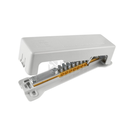 Svorkovnice ekvipotenciální POT 25/16 - krytá svorka, 2-řadá. Připojení páskového zemniče o rozměru 30×4mm, 1x drát 8-10mm, 1x vodič 50mm2, 7x vodič 6-25mm2