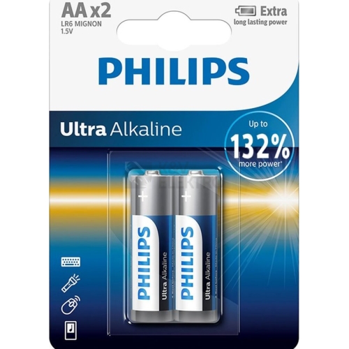 Pořiďte si balení dvou AA baterií od oblíbené značky Philips. Řada Philips Ultra Alkaline nabízí výkonné alkalické baterie, které disponují oproti běžným alkalickým bateriím až o 30 % více energie. Alkalické tužkové baterie využijete pro zařízení s vysokou spotřebou energie, jako jsou digitální fotoaparáty, svítilny, elektrické hračky nebo MP3 přehrávače. Tento výrobek se prodává v blistru, který obsahuje 2 ks. Uvedená cena je za 1 ks baterie. Tužkové baterie AA Ultra Alkaline od firmy Philips jsou typu LR6 a jejich napětí je 1,5 V. Vybírejte ze všech klasických AA baterií na našem e-shopu. Nabízíme i široký sortiment dalších druhů článkových baterií: mikrotužkové AAA baterie, knoflíkové baterie, buřty (tedy baterie D) či plochá baterie. Zvažte i pořízení nabíjecích baterií. O firmě Philips Světoznámá společnost Philips & Co. byla založena v roce 1891 v nizozemském Eindhovenu s cílem uspokojit rostoucí poptávku po žárovkách, která nastala v důsledku komercionalizace elektřiny. V současnosti nabízí Philips široké spektrum vysoce kvalitních produktů z oblasti elektroniky a elektrotechniky. V našem sortimentu naleznete například LED žárovky Philips, halogenové žárovky, svítilny, zářivky, ale i stropní a nástěnná svítidla, podhledová svítidla či kuchyňské zářivky a osvětlení. Prohlédněte si náš kompletní sortiment od firmy Philips.