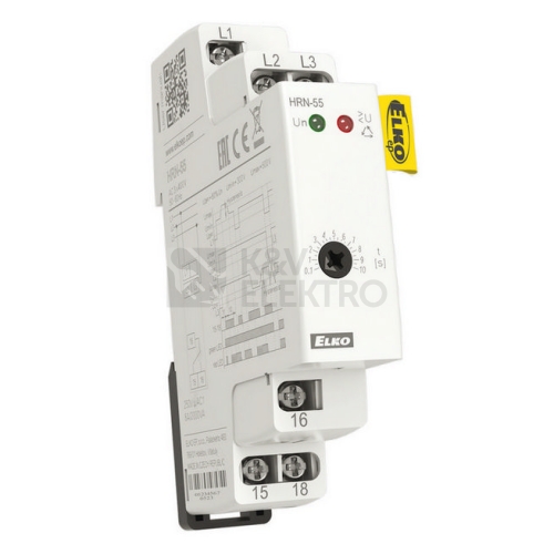 Relé kontroluje sled, výpadek fází a překročení hlídaného napětí ve 3-fázových sítích. POPIS Kontrola správného otáčení motorů, pohonů apod. Pevná prodleva T1 (500ms) a nastavitelná prodleva T2 (0.1 – 10 s). Hlídací napěťové relé ve dvou provedeních: HRN-55: napájeno ze všech fází, tzn. že funkce relé je zachována i při výpadku jedné z fází HRN-55N: napájeno z L1-N, tzn. že relé hlídá i po přerušení nulového vodiče Chybový stav je indikován LED a rozepnutím výstupního kontaktu relé. TECHNICKÉ PARAMETRY napájecí a hlídané napětí HRN-55: 3 x 400 V HRN-55N: 3 x 400 V/ 230 V horní úroveň (Umax): 125% hlídaného napětí spodní úroveň (Umin) 75% hlídaného napětí výstupní kontakt: 1x přepínací 8 A/250 V AC1 (AgNi, 2500 VA) v provedení 1-MODUL, upevnění na DIN lištu