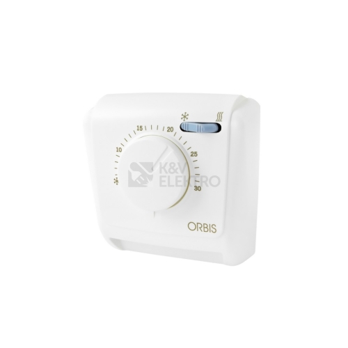 Termostat ORBIS CLIMA MLW, pokojový, mechanický, maximální zatížení kontaktů 10A (1,5A) 250V AC, montáž na povrch / do přístrojové krabičky, krytí IP20. Termostat CLIMA MLW má manuální přepínač s funkcí topení, klimatizace nebo vypnutí termostatu.