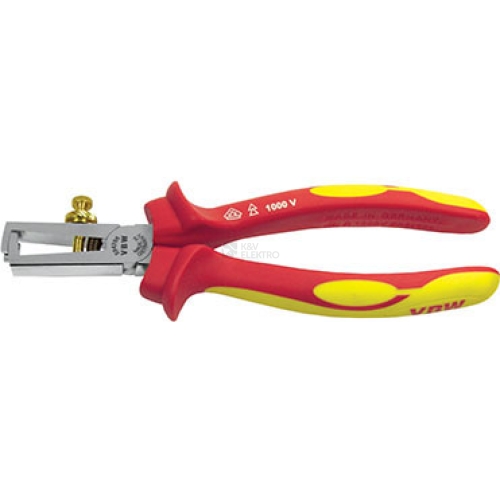 Kleště odizolovávací 1000V vyrobeny ze speciální nástrojové oceli, kalené v oleji, chromované, leštěné se stavitelným šroubem a pružinou, k nastavení potřebného průměru vodiče nebo licny do 10mm2 nová pohodlná multikomponentní rukojeť speciálně tvarovaná proti sklouznutí ruky směrem k čelisti rukojeť vyrobena ze speciální plastické hmoty odolávající agresívnímu prostředí VDE izolace dle DIN EN 60 900 IEC 60 900 pro práci pod napětím izolace bezpečná při práci až do 1000V AC 1500 V DC ##VIDEO:https://www.youtube.com/embed/8O9y253NZPk##