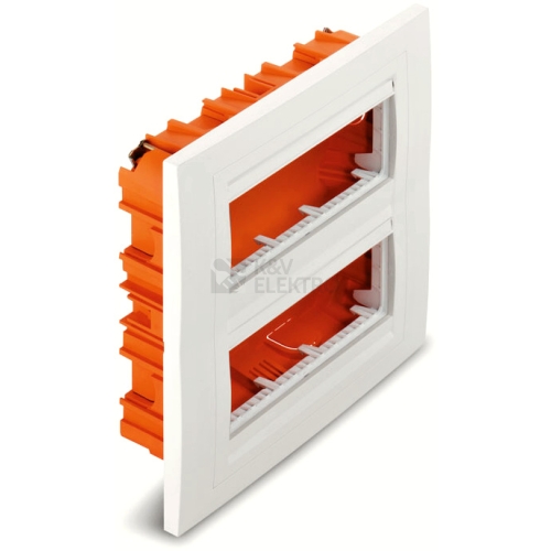 1 řada = 135 x 45 mm = 6 modulů obsahuje instalační krabici, rámy a šrouby, štít, držáky na štítky, štítky, vložku, úchytky do dutých příček a ochranný karton pro dokončovací práce (omítání)