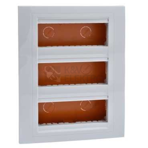 Barva Polar U22.736.18 (1 řada = 135 x 45 mm = 6 modulů), obsahuje instalační krabici, montážní rámečky a šrouby, krycí rámeček, držáky na štítky, štítky, vložku, úchytky do dutých příček a ochranný karton pro dokončovací práce (omítání)