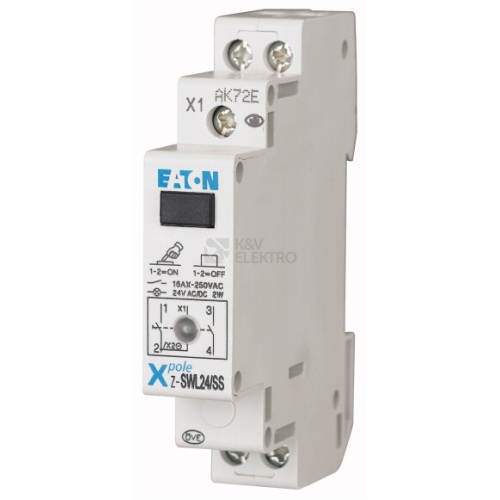 Spínače s LED, funkce: 2 spínací kontakt, jmenovitý povozní proud 16A, jmenovité provozní napětí spínače 250 V AC, jmenovité provozní napětí LED 24 V AC, barva tlačítka černá, barva LED oranžová, vestavný rozměr víčka 45 mm, šířka při montáži 1HP (17,5 mm), montáž na montážní lištu, průřez svorky 1-10 mm², provedení dle normy IEC/EN 60669, VDE 0632