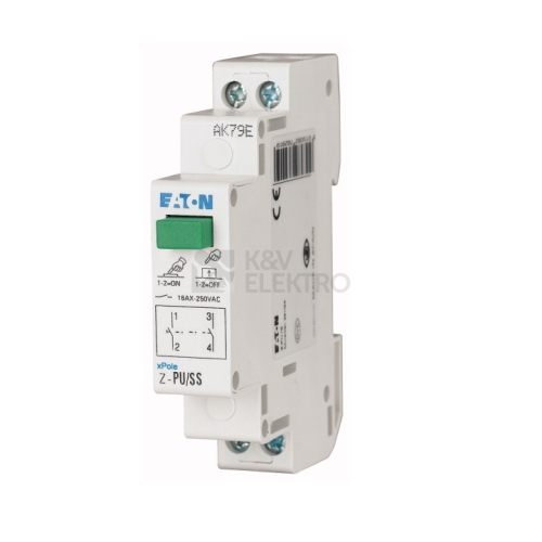 Tlačítko, funkce: 2 spínací kontakt, jmenovitý povozní proud 16A, jmenovité provozní napětí 250 V AC, barva tlačítka zelená, vestavný rozměr víčka 45 mm, šířka při montáži 1HP (17,5 mm), montáž na montážní lištu, průřez svorky 1-10 mm², provedení dle normy IEC/EN 60669, VDE 0632