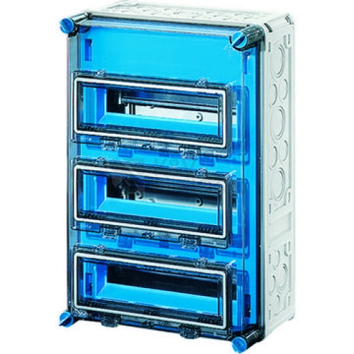 Skříně pro montáž kombinací energetických spínačů do 630 A nebo jako jednotlivé skříně. Z vysoce kvalitního polykarbonátu s ochrannou izolací. Stěnové průchodky s velkými otvory pro elektrické připojení skříní. Kabelové vstupy na všech stěnách skříní přes metrické předlisy nebo montážní příruby. Skříně pro upevnění na stěnu také pomocí vnějších patek nebo s montážními lištami. Jističová skříň s 36 modulovými jednotkami k zabudování řadových modulových přístrojů dle DIN 43 880. S PE a N svorkami pro měděné vodiče. N oddělitelný pro různé potenciály. S krycím páskem pro uzavření nevyužitých výřezů v krycí desce pro modulové přístroje a popisovými štítky pro identifikaci proudových obvodů. Průhledné odklápěcí víko, s příslušenstvím uzamykatelné. Uzávěry víka pro ruční ovládání.