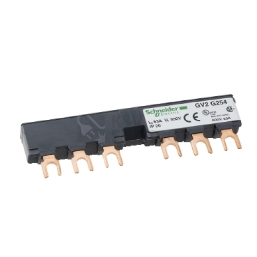 TeSys GV sada sběrnic - 3 fáze - 63A/690V - pro nadřazené paralelní zapojení skupin motorových spouštěčů složených z GV2 motorových jističů nebo LS1D32 pojistek. Pro použití se šroubovými vývody se skládá ze 2 vývodů pro paralelní zapojení 2 zařízení s roztečí 54 mm. Pro napájení sady přípojnic (objednat samostatně) je doporučeno použití svorkovnice GV1G09 nebo GV2G05. Splňuje požadavky normy Green Premium (RoHS/REACH).