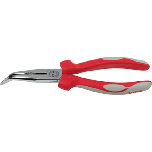 Kleště telefonní zahnuté 45° 160mm vyrobeny ze speciální nástrojové oceli, kalené v oleji, chromované, leštěné zahnuté půlkulaté ozubené čelisti k uchopení menších součástí, indukčně kalené břity cca. 60 HRc pro štípání tvrdého a středně tvrdého drátu nová pohodlná multikomponentní rukojeť speciálně tvarovaná proti sklouznutí ruky směrem k čelisti rukojeť vyrobena ze speciální plastické hmoty odolávající agresívnímu prostředí