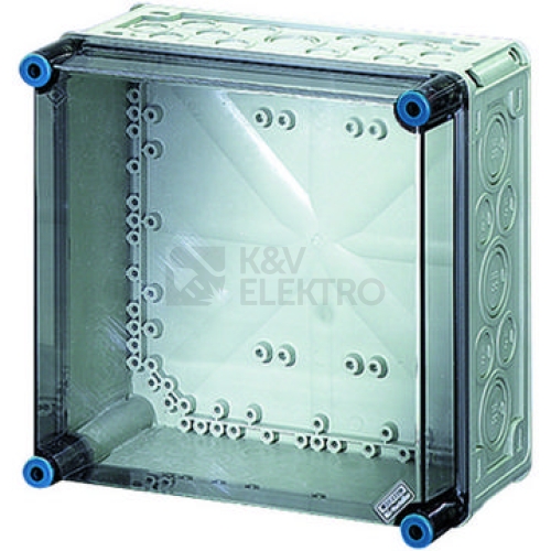 Skříně pro montáž kombinací energetických spínačů do 630 A nebo jako jednotlivé skříně. Z vysoce kvalitního polykarbonátu s ochrannou izolací. Stěnové průchodky s velkými otvory pro elektrické připojení skříní. Kabelové vstupy na všech stěnách skříní přes metrické předlisy nebo montážní příruby. Skříně pro upevnění na stěnu také pomocí vnějších patek nebo s montážními lištami. Prázdná skříň s průhledným víkem. Montážní rozměry š 275 x v 275 x h 150 mm. Pro montáž přístrojů na montážní desku nebo na nosnou lištu DIN. Max. vestavná hloubka při zabudované montážní desce 146 mm, při zabudované nosné liště 135 mm. Uzávěry víka otevíratelné pomocí nástroje.