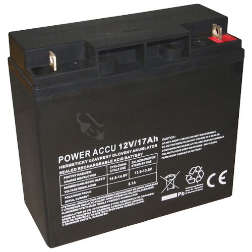 Bezúdržbový olověný akumulátor ACCU Upozornění: v případě sezónního používání akumulátorů (lodě, dětské hračky apod.), nebo v případě dlouhodobého nevyužití akumulátoru je nutno před uskladněním akumulátor nabít, uskladnit akumulátor na chladném místě (kdy je samovybíjení akumulátoru nejnižší) a nabíjení opakovat každé 3 až 4 měsíce. Technická specifikace akumulátoru Nominální napětí 12 V Kapacita ( 20 h, 25 °C ) 17 Ah Rozměry 181 × 77 × 167 × 167 mm ( délka × šířka × výška × výška včetně kontaktů ) Váha 4.92 kg Vnitřní odpor ( plné nabití, 25 °C ) 13 mΩ Kapacita ( 20 h ) 103% ( 40 °C ), 100% ( 25 °C ), 86% ( 0 °C ) Maximální konstantní vybíjecí proud 62.9 A ( 5 min. ) Provozní podmínky 10 °C až 40 °C Plovoucí nabíjecí napětí ( 25 °C ) 13.6 ˜ 13.8 V Cyklické nabíjecí napětí ( 25 °C ) 14.1 ˜ 14.4 V Maximální nabíjecí proud 4.25 A Typ konektorů konektor T3 pro šroub 5mm Charakteristika vybíjení akumulátoru konstantním proudem (A, 25 °C): Napětí na článek 5min 10min 20min 45min 1h 2h 4h 8h 10h 20h 1.70V 62.9 40.9 22.9 11.9 10.2 6.04 3.44 1.95 1.62 0.870 1.75V 62.3 40.5 22.6 11.8 10.1 5.86 3.38 1.93 1.61 0.860 1.80V 61.7 40.1 22.4 11.6 10.1 5.58 3.28 1.91 1.59 0.850 Charakteristika vybíjení akumulátoru při konstantním výkonu (Watt, 25 °C) Napětí na článek 5min 10min 20min 45min 1h 2h 4h 8h 10h 20h 1.70V 755 491 275 143 122 72.5 41.3 23.4 19.3 10.4 1.75V 748 486 271 142 121 70.3 40.6 23.2 19.2 10.2 1.80V 740 781 269 139 121 67.0 39.4 22.9 18.9 10.1 12V/17Ah - POWER ACCU - Bezúdržbový olověný akumulátor 12V / 17 Ah nevyžaduje žádnou zvláštní údržbu(nemusí se dolévat elektrolit...). Použití nejmodernější výrobní technologie zajišťuje stabilní výkon akumulátoru. Bezúdržbové akumulátory 12V / 17 Ah POWER ACCU mají široký rámec využití. Používají se jako náhradní zdroj energie u zařízení vyžadujících dlouhodobou spolehlivost, například u elektronických zabezpečovacích systémů, telekomunikačních zařízení apod. Akumulátory 12V / 17 Ah POWER ACCU najdou uplatnění všude tam kde není požadavek na zapojení akumulátorů v sérii.