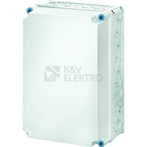 Skříně pro montáž kombinací energetických spínačů do 630 A nebo jako jednotlivé skříně. Z vysoce kvalitního polykarbonátu s ochrannou izolací. Stěnové průchodky s velkými otvory pro elektrické připojení skříní. Kabelové vstupy na všech stěnách skříní přes metrické předlisy nebo montážní příruby. Skříně pro upevnění na stěnu také pomocí vnějších patek nebo s montážními lištami. Prázdná skříň s neprůhledným víkem. Montážní rozměry š 275 x v 425 x h 195 mm. Pro montáž přístrojů na montážní desku nebo na nosnou lištu DIN. Max. vestavná hloubka při zabudované montážní desce 191 mm, při zabudované nosné liště 180 mm. Uzávěry víka otevíratelné pomocí nástroje.