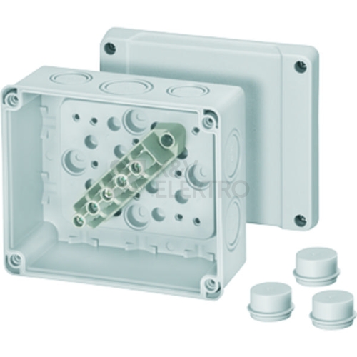 Kabelové rozvodky podle IEC 60670-22, s namontovanou spojovací svorkou a metrickými predlisy . Urceno pro vnitrní prostredí a chránené venkovní prostredí podle DIN VDE 0100, díl 737. pro teplotu prostredí max. + 40 °C a min. - 25 °C, pri relativní vlhkosti vzduchu 50% pri 40 °C nebo 100% pri 25 °C. Tepelná odolnost materiálu od - 25 °C do 70 °C, Odolnost proti požáru podle VDE 0471, díl 2 - Zkouška žhavou smyckou 750 °C, UL Subject 94 V-2. Krytí podle IEC 60529: IP 55 s nástrcnými kabelovými vývodkami, Typ ESM, IP 65 s kabelovými vývodkami, Typ AKM. Jmenovité izolacní napetí: 690 V, DIN VDE 0110. Materiál: Termoplast, bez halogenu a bez silikonu. Barva: šedá, RAL 7035. Upevnovací šrouby víka z nerezové oceli V2A. Výrobek: HENSEL DK. Jmenovitý prurez: 6 mm², 5pol.svorka
