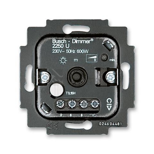 Přístroj stmívače pro otočné ovládání a tlačítkové spínání Stmívač osvětlení má tlačítko na spínání a otočné ovládání na regulaci intenzity světla. Má možnost nastavení minimálního nastavení jasu. Stmívač se upevňuje šrouby a drápky, je určen pro některé úsporné žárovky, pro halogenové a vakuové žárovky. Je kovová a kryt se dá doplnit o doutnavku, kterou lze dokoupit. Lze kombinovat s přepínačem řazení 6, popř. 6 a 7 (pomocí přepínačů lze svítidlo pouze spínat, ovládat jas není možné). min. 60 W, max. 600 W pro vakuové a halogenové žárovky, 230 V AC (min. 10 W, max. 100 W pro stmívatelné kompaktní zářivky, 230 V AC) Upevnění šrouby nebo drápky. Šroubové svorky (pro vodiče max. 2,5 mm²). Podívejte se i na svítidla, která mohou být se správným zdrojem stmívací.