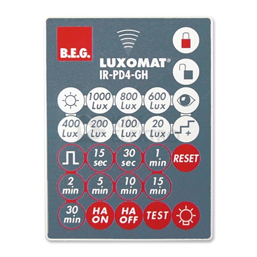 Infračervené dálkové ovládání pro pohodlné nastavení nebo změnu parametrů. Kompletní s nástěnným držákem. Jednoduché naprogramování detektoru pohybu PD4-M-1C-GH.Rozměry : 80 x 60 x 8 mm(in translation) zatažený/tmavý max. 5 až 6 m sluneční svit max. 2 až 3 mAccu: lithium 3,0 VVýrobce: B.E.G. Brück Electronic GmbHBarva: šedáVýr. číslo: 92215Typ: IR-PD4-GH