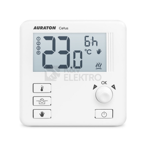 Šetřete náklady na topení s jednoduchým denním termostatem Auraton Cetus s možností aktivace automatického nočního poklesu a režimem dovolené s možností nastavení jiné teploty na dobu od 1 min – 8 dní. FrostGuard chrání při vypnutí termostatu systém vytápění tak, že zabraňuje poklesu teploty prostředí pod 2 °C. Elektronický termostat snadno a intuitivně nastavíte na podsvětleném LCD displeji. Termostat Auraton Cetus má pracovní rozsah teplot 0° – 45 °C, rozsah měření teploty 0° – 35 °C a rozsah řízení teploty 7° – 35 °C. Přesnost regulace se pohybuje +/- 0,2 °C (nově PMW viz manuál). Maximální zatížení termostatu je 16 A. Zařízení je je napájeno 2x AAA bateriemi které jsou součástí balení. Stupeň krytí je IP20. Podívejte se i na další kvalitní termostaty Auraton a další programovatelné termostaty v naší nabídce. Vybírat můžete také z obdobných výrobků značek ABB, Elektrobock, Elko EP, Legrand či Schneider. Termostaty můžete efektivně regulovat například podlahové vytápění, elektrické konvektory či akumulační kamna. O firmě Auraton Auraton je lídrem v oblasti termostatů ve střední a východní Evropy. Laboratoře, výzkumné centrum i výrobní linky se nacházejí v Polsku, firma je alempřítomná ve více než 120 zemích včetně České republiky. Na našem e-shopu vybírejte z kvalitních pokojových termostatů Auraton.
