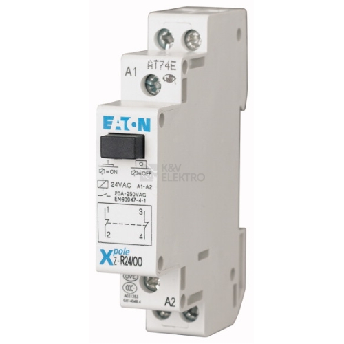Instalační relé s ručním ovládáním, řídicí napětí 24V 50Hz, funkce: 2 rozpínací kontakt, jmenovitý povozní proud 20 A, 250V AC, provedení dle normy IEC/EN 60947, vestavný rozměr víčka 45 mm, šířka při montáži 1HP (17,5 mm), montáž na montážní lištu, průřez svorky 0,5–10 mm² jednodrátový a vícedrátový / 0x5–6 mm² lankový s dutinkou