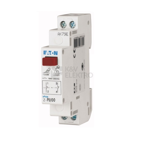 Tlačítko, funkce: 2 rozpínací kontakt, jmenovitý povozní proud 16A, jmenovité provozní napětí 250 V AC, barva tlačítka červená, vestavný rozměr víčka 45 mm, šířka při montáži 1HP (17,5 mm), montáž na montážní lištu, průřez svorky 1-10 mm², provedení dle normy IEC/EN 60669, VDE 0632