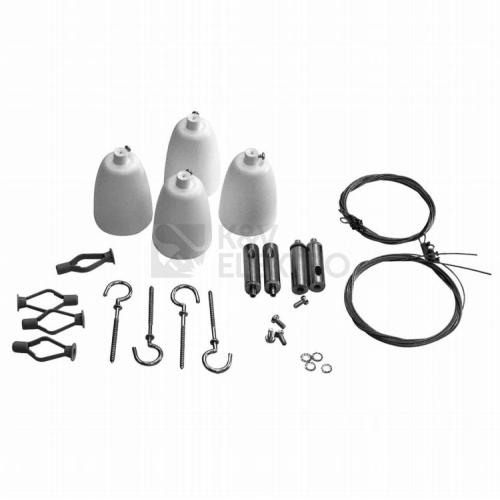 Doplňující informace ZH22 Sada pro závěsnou montáž svítidel (starý kód 54103). Obsahuje: - 4 ks lanko ocelové 2m - 4 ks samosvorný jezdec B pro upevnění do svítidla - 4 ks hák do stropu - 4 ks hmoždinka - 4 ks kalíšek Použitelná pro modelové řady svítidel LL, LLX, LLY, SLIM, K, KL, KM, KS, KV, EPOS, EXA (4x), Q