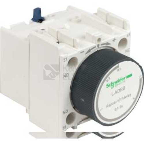 TeSys D - blok pomocných kontaktů - pro stykače LC1D - LC1F a CAD. Poskytuje kontakty 1Z+1V jmenovité až 10A 690V AC, rozsah nastavení prodlevy 0.3-3s, připojení šroubovými svorkami. Nacvakávací čelní montáž zajišťuje vysokou spolehlivost a odolnost. Certifikováno více standardů (IEC, UL, CSA, CCC, EAC), Green Premium (RoHs/Reach).