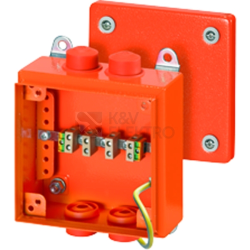 Kabelová krabicová rozvodka z práškově lakovaného ocelového plechu se zachováním funkčnosti v případě požáru ve spojení s kabely pro zachování funkčnosti. Třída zachování funkčnosti E30 až E90. Pro nástěnné aplikace v budovách nebo chráněnou instalaci ve venkovním prostředí. S vysoce tepelně odolnou keramickou svorkou pro měděné vodiče a namontovanými nástrčnými ucpávkovými kabelovými vývodkami. Uchycení pomocí stěnových úchytů. S 5pólovou svorkovnicí. Jako rozvodná skříň 0,5 až 1,5 mm² nebo spojovací skříň do 4 mm².