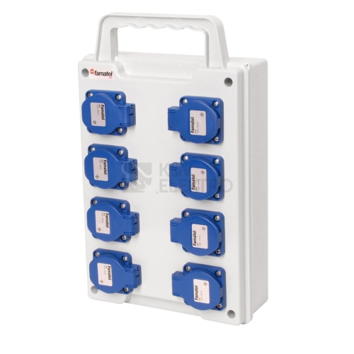 Přenosná zásuvková skříň FAMATEL eb705-EB800000.0 /4M IP44 bez jištění a bez chrániče (rozbočka), zásuvky 8x230V, použité pouzdro: 6201-00 - 355x215x85mm, barva: světle šedá.