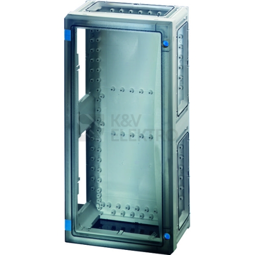 Skříň s dvířky pro montáž instalačních rozváděčů do 250 A pro ovládání běžnými osobami v souladu s normou IEC 61439-3. Otevřené stěny skříně pro kombinaci nebo jako samostatné skříně s krycími deskami. Z vysoce kvalitního polykarbonátu s ochrannou izolací. Rychlé spojení skříní pomocí konektorů a integrovaných těsnění. Stěnové průchodky s velkými otvory pro elektrické připojení skříní. Kabelové vývodky přes příruby. Upevnění na stěnu přímo na skříni pomocí vnějších úchytek nebo pomocí montážních lišt. Prázdná skříň s průhlednými dvířky a dveřním uzávěrem s ovládáním nástrojem. Pro montáž přístrojů na montážní desku nebo na nosnou lištu DIN. Montážní rozměry š 216 x v 486 x h 140 mm. Max. vestavná hloubka při zabudované montážní desce 136 mm, při zabudované nosné liště 125 mm. Plombovací sada pro plombování dveří se musí objednat samostatně.