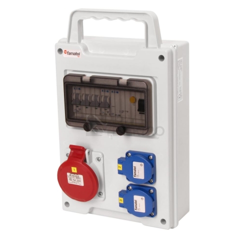 Přenosná zásuvková skříň FAMATEL eb165-EB201000.1 /8M IP44 jištěná s chráničem 40/4/003, zásuvky 2x230V, 1x16/5, přístroje EATON 10kA: 1xPL7-B16/1, 1xPL7-B16/3, PF7-40/4/003 na vstupu, použité pouzdro: 6201-20 (8mod.) - 355x215x85mm, barva: světle šedá.Přenosná zásuvková skříň (rozváděč nízkého napětí) FAMATEL eb165-EB201000.1 /8M IP44 jištěná s chráničem 40/4/003, zásuvky 2x230V/16A (s ochranným kolíkem dle ČSN), 1x400V/16A/5pól, jistící přístroje EATON 10kA: 1xPL7-B16/1, 1xPL7-B16/3, PF7-40/4/003 na vstupu (citlivost na reziduální proud 30mA), použité pouzdro: 6201-20 - celkem k dispozici 8mod. míst, rozměry: 355x215x85mm, plastová, materiál ABS, IK08, zkouška žhavou smyčkou 650°C, bezhalogenová a UV odolná, montáž na povrch, barva: světle šedá, rozsah teplot -25°C +85°C, aplikované normy: IEC 61439-3 (Rozváděče nízkého napětí - Část 3: Rozvodnice určené k provozování laiky (DBO), balení: 1ks (fólie), zásuvky na 230V/16A s ochranným kolíkem dle ČSN, polykarbonátové okénko, jistící prvky EATON, PE svorkovice součástí (6x16mm2), N svorkovice součástí (6x16mm2), hladké stěny (bez prolisů) pro vyvrtání vstupního otvoru a následné osazení příslušnou vývodkou, max. připojitelný vstupní kabel = 5x16 (Cu), dodáno s průvodní dokumentací: štítkem rozváděče, návodem pro obsluhu a montáž, krycím listem (charakteristiky rozhraní), protokolem o kusové zkoušce, ES prohlášením o shodě, schématem zapojení a zkouškou oteplení pro rozváděče nízkého napětí.