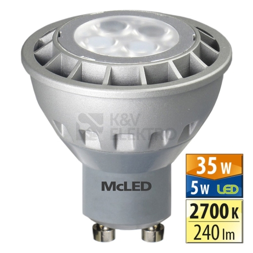 LED žárovka GU10 od české firmy McLED vyniká výhodným poměrem kvality a výkonu. LED reflektor GU10 se používá především do vestavných svítidel a bodovek. Žárovku je po zasunutí potřeba pootočit. LED žárovka GU10 má výkon 5 W, což je ekvivalentem 35 W u klasických žárovek. Teplota chromatičnosti činí 2700 K (teplá bílá barva), průměrná životnost těchto LED reflektorů dosahuje 30.000 hodin, světelný tok činí 240 lm a vyzařovací úhel je 60°. Prohlédněte si i další LED žárovky GU10 nebo vybírejte mezi dalšími LED žárovkami, jako je nejběžnější LED žárovka E27 a LED žárovka E14. Zakoupit můžete také stmívatelné žárovky, LED pásky, LED trubice či halogenové žárovky. Vybírejte z kompletní nabídky osvětlení na našem e-shopu včetně svítidel pro žárovky s paticí GU10. O společnosti McLED Společnost McLED s.r.o. je mladá česká firma, která se specializuje na kvalitní a úsporné LED osvětlení, se sídlem ve Vestci u Prahy. Kromě LED pásků McLED nabízí McLED také širokou škálu LED žárovek, svítidel na stěnu, vestavného osvětlení McLED či zářičů.