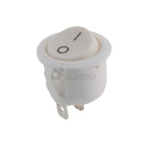 Vypínač síťový kolébkový, 1pólový, kulatý, bílý, bílý hmatník, ON-OFF Montážní otvor průměr 20mm. Podsvícení hmatníku Ne Proud 6A Napětí 250V Barva hmatníku Bílý