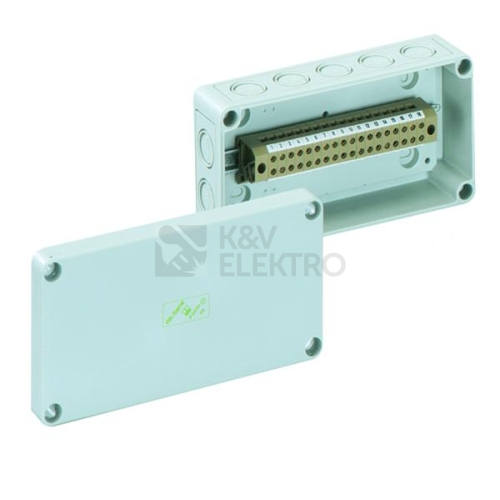 Skříň pro řadové svorkovnice, se stupněm krytí IP54/IP66, Jmenovitý průřez 4mm², Ui=400V AC, polystyren, Vnitřní místa pro připevnění, pro standardní instalace ve vnitřním prostoru, osazené 22-pólovou blokovou svorkou 4mm² (typ Contaclip BKA 4), Rozměry: 180 x 94 x 57mm, Přiložené příslušenství: 8 s vývodkami IP54 M20, rozsah těsnění 8-13,5mm