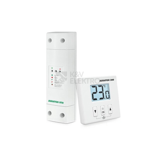 AURATON 200 RTH je denní bezdrátový termostat s mnoha možnostmi nastavení. Má podsvícený LCD, vestavěný stojánek a jeho obsluha je jednoduchá. Bezdrátový termostat s nočním poklesem Popis denní bezdrátový termostat s možností aktivace nočního poklesu noční pokles: automatické opakovaní nočního poklesu každý den ve stejnou dobu (snížení teploty o 3°C na 6 hodin) podsvícený LCD jednoduchá obsluha vestavěný stojánek Dosah: v průměrné budově, při standardní konstrukci stěn cca 30m, na otevřeném prostranství až 300m. přijímač Auraton RTH (součást balení) je vybaven relé, umožňujícím pracovat do zatížení 16A a technologií, zajišťující nízké opotřebení relé kontaktů rozměry termostatu Auraton 200: 70 x 70 x 10mm Specifikace rozsah regulace 7 – 30°C pracovní teplota 0 – 45°C přesnost regulace +- 0,2°C napájení termostatu 2 baterie AAA 1,5 V napájení přijímače RTH 230V AC, 50 Hz Podívejte se i na další termostaty Auraton a ostatní termostaty z naší nabídky.