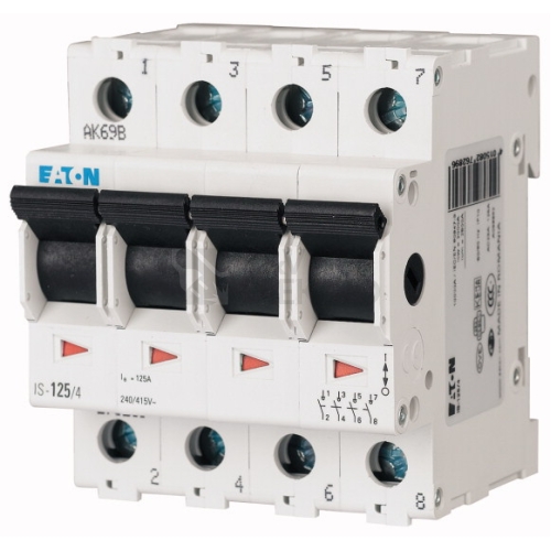 Hlavní vypínač IS Použití jako hlavní vypínače rozváděčů Jmenovité napětí 240 / 415 V AC Zkratová odolnost 12,5 kA (pro In = 16–80 A) a 6 kA (pro In = 100–125 A) Strana síťového připojení libovolná Kategorie užití AC-22 Stupeň krytí IP10 Průřez připojovaných vodičů 2,5–50 mm2 Libovolná montážní poloha