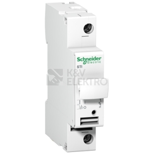 Tento Acti 9 STI odpojovač pojistky je nízkonapěťový. Používá se pro terciární a průmyslové aplikace, které vyžadují vysokou vypínací kapacitu. Má 1P pól, jmenovitý proud až 25 A a charakteristiku pojistky gG nebo aM s pojistkou typu pojistky 10,3 mm x 38 mm. lze jej upevnit na lištu DIN pro modulární instalaci. Pojistka pro všeobecné použití (pojistka gG) poskytuje ochranu proti přetížení a zkratu. Pojistka aM pro aplikace motorů poskytuje ochranu proti zkratu (ochrana zařízení s vysokým špičkovým proudem). má stupeň ochrany IP20 na svorkách, takže je jednou IP40 v modulární skříni. Nacvakávací značka je viditelná na přední straně nebo na přiřazené svorce a identifikuje přítomnost pojistky. Volitelné neonové světlo 230V signalizuje zhasnutí pojistky (vypnutí při běžném provozu a svítí červeně po vyfukování pojistky). Zařízení je vybaveno držákem pojistky a přídavným krytem pro náhradní pojistku. Páčka může být také zamknutá.