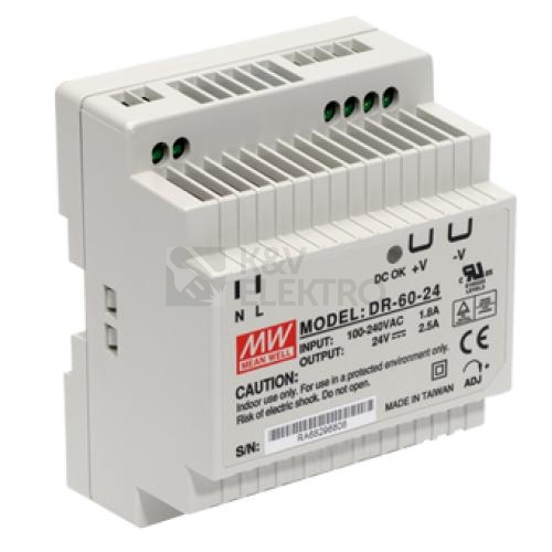 Spínaný síťový zdroj na DIN lištu MEAN WELL 24V/2,5A, 60W. Výstupní napětí: 24V Regulace výstupního napětí: 21,6..26,4V Výstupní proud: 2,5A Skutečný výkon: 60W Vstupní napětí AC: 88..264V Odběr při 230V AC: 0,8A Účinnost: 84% Studený start: 36A Integrované ochrany: Přetížení, zkrat, přepětí Pracovní teplota: -20..60°C Hmotnost: 0,3kg Rozměry: 78 x 93 x 56mm