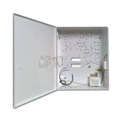 Kryt ústředny 320 x 395 x 120mm s instalovaným transformátorem 16V/50VA, ochranným kontaktem TAMPER. Vyrobené v ČR. Vlastnosti: Transformátor 16V/50VA Odnímatelné víko na pantech Zemnící kontakty, vodiče, tampér Předlisovaný otvor pro zámek Plastové distanční nožky - zajišťují odsazení od stěny 8 mm Prostor pro Aku 17Ah/12V Technické parametry Rozměry: 320 x 395 x 120mm Barva: 9003 lesklá