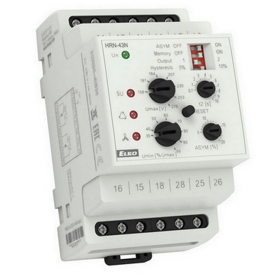 Hlídací relé s kompletní kontrolou se používá pro 3-fázovou kontrolu v síti, kontrolu a ochranu sítě, regulaci napětí z generátoru nebo vodní elektrárny. POPIS V 3-fázových sítích hlídá a kontroluje: a) Napětí v dvou úrovních (přepětí a podpětí). b) Asymetrii fází c) Pořadí fází d) Výpadek fáze Nastavitelná funkce PAMĚŤ – pro návrat z chybového do normálního stavu je treba stisknout tlačítko RESET. Funkce druhého relé (samostatně/paralelně). Pevné zpoždění T1 (200ms) a nastavitelné zpoždění T2 (0.1 – 10 s) pro eliminaci krátkodobých výpadků a špiček. Hlídací relé v dvou provedeních: HRN-43: určené pro obvody bez nulového vodiče (3 x 400 V) HRN-43N: určené pro obvody s nulovým vodičem (3 x 400 V/230 V) TECHNICKÉ PARAMETRY Napájecí napětí AC 230 V, AC 400 V, AC/DC 24 V, galvanicky oddělené. Horní úroveň (Umax): HRN-43: 240 – 480 V HRN-43N: 138 – 276 V Spodní úroveň (Umin): 35 – 99% kontrolovaného napětí. Výstupní kontakt: 2x přepínací 16 A/250 V AC1 (AgNi, 2500 VA). V provedení 3-MODUL, upevnění na DIN lištu.
