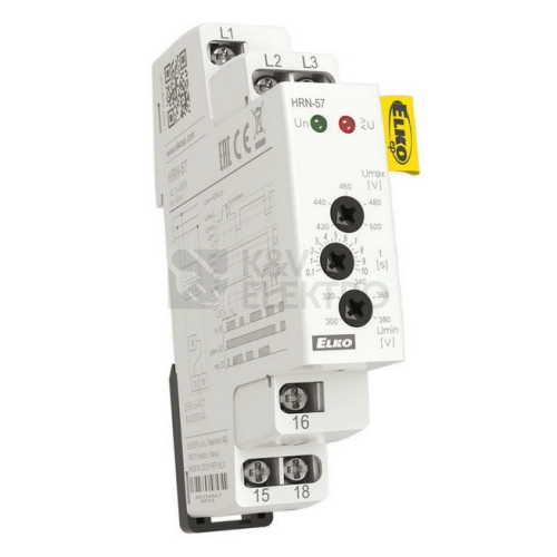 Relé pro hlídání napětí v rozvaděči (ochrana přístrojů a zařízení) monitoruje velikost napětí v 3-fázové síti. POPIS Nehlídá sled fází. Napájení přístroje se provádí z hlídaného napětí. Pevná prodleva T1 (500ms) a nastavitelná prodleva T2 (0.1 – 10 s) pro eliminaci krátkodobých výpadků a špiček. Pokud napájecí napětí poklesne pod 60 % Un (UOFF spodní úroveň) dojde k okamžitému rozepnutí relé bez uplatnění zpoždění. Možnost nastavení horní a dolní hranici napětí, při které kontakt výstupního relé vypne. Napěťové relé ve dvou provedeních: HRN-57: napájeno ze všech fází, tzn. že funkce relé je zachována i při výpadku jedné z fází HRN-57N: napájeno z L1-N, tzn. že relé hlídá i po přerušení nulového vodiče Chybový stav je indikován LED a rozepnutím výstupního kontaktu relé. TECHNICKÉ PARAMETRY napájecí a hlídané napětí HRN-57: 3 x 400 V HRN-57N: 3 x 400 V/ 230 V horní úroveň (Umax): 105 – 125% hlídaného napětí spodní úroveň (Umin): 75 – 95% hlídaného napětí výstupní kontakt: 1x přepínací 8 A/250 V AC1 (AgNi, 2500 VA)