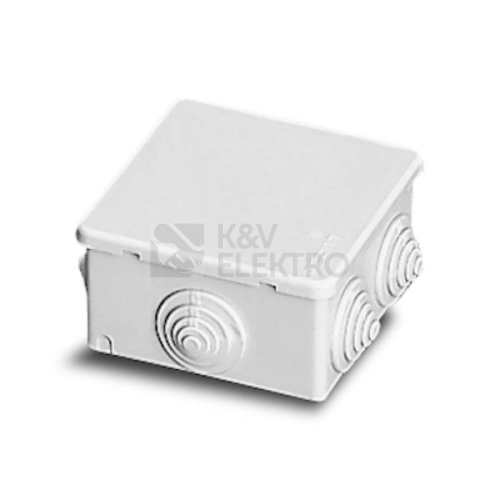 Plastová elektroinstalační krabice na povrch s průchodkovými membránami. Krytí IP44, rozměr 80x80x40mm. Plné nasazovací víko. Barva RAL 7035 šedá.