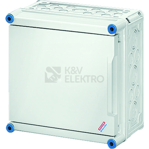 Skříně pro montáž kombinací energetických spínačů do 630 A nebo jako jednotlivé skříně. Z vysoce kvalitního polykarbonátu s ochrannou izolací. Stěnové průchodky s velkými otvory pro elektrické připojení skříní. Kabelové vstupy na všech stěnách skříní přes metrické předlisy nebo montážní příruby. Skříně pro upevnění na stěnu také pomocí vnějších patek nebo s montážními lištami. Prázdná skříň s neprůhledným víkem. Montážní rozměry š 275 mm x v 275 mm x h 119 mm. Pro montáž přístrojů na montážní desku nebo na nosnou lištu DIN. Max. vestavná hloubka při zabudované montážní desce 115 mm, při zabudované nosné liště 104 mm. Uzávěry víka otevíratelné pomocí nástroje.