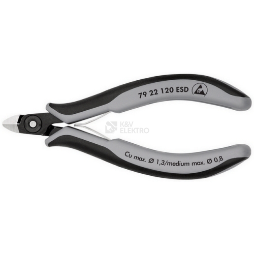 Rukojeti elektricky svodivé - disipativní. Precizní kleště pro nejjemnější stříhací práce např. v elektronice a jemné mechanice. Velmi přesně broušené, ostré břity s velmi malými fazetami na přesné řezy u citlivých elektronických součástek, rovněž bez fazet pro přesné odštípnutí. Břity doplňkově induktivně tvrzené, tvrdost břitů asi 64 HRC kováno. Hmotnost cca o 20 % nižší než u konvenčních kleští na elektroniku. šroubový kloub s precizně vyrobenými kloubními plochami pro rovnoměrný pohyb s malým třením v celém rozsahu rozevření.. Dvojitá pružina s malým odporem pro snadné a rovnoměrné rozevření.. Ergonomicky optimalizované vícesložkové návleky rukojetí. Chromovaná ocel na kuličková ložiska, kalená v oleji v několika stupních. Mini hlava.