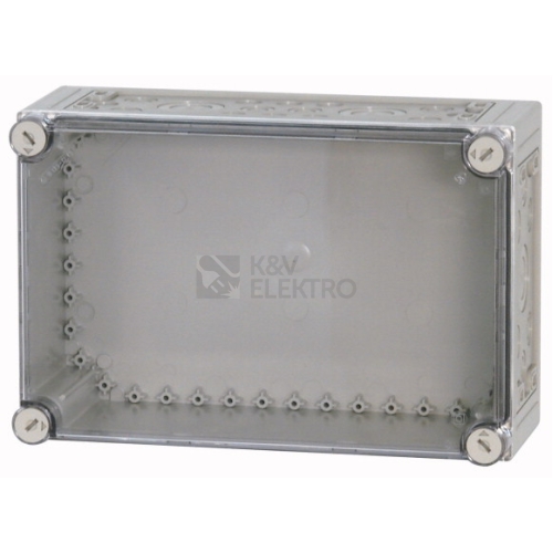 Skříňka s průhledným víkem, material: Polykarbonát, odolná proti nárazům, stupeň krytí IP65, patentované upevňovací šrouby víka s in tegrovaným vyrovnáním přetlaku, s metrickými vylamovacími otvory ve všech bočnicích, přívod vedení nahoře a dole vždy=2xM50/32 a 6xM25/16 a 8xM20, po straně vždy=1xM50/32 a 6xM25/16, upevňovací oka k upevnění na stěnu, upevňovací šrouby s možností plombování, bočnice vyrážecí, jako panelové kryty lze obestavět přidáním bočnic, RAL 7032, štěrkově šedá (dolní část skříňky), průhledná, bezbarvá (víko), vestavná hloubka s montážním plechem=125 mm, provedení krytu: průhledné, provedení dolní díl: předem ražené, kryt lze volitelně dovybavit válcovým zámkem DVZ...-CI