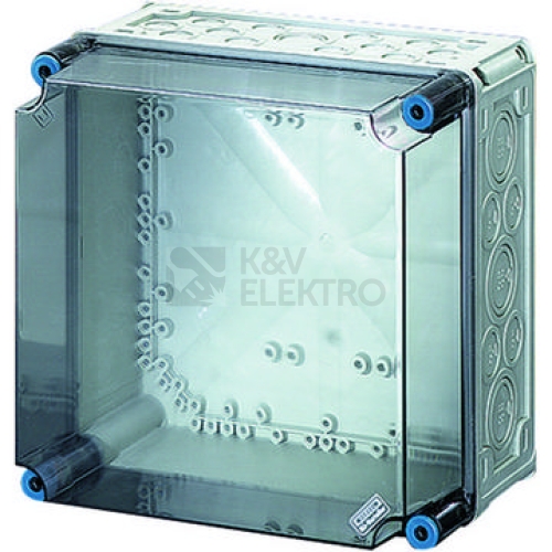 Skříně pro montáž kombinací energetických spínačů do 630 A nebo jako jednotlivé skříně. Z vysoce kvalitního polykarbonátu s ochrannou izolací. Stěnové průchodky s velkými otvory pro elektrické připojení skříní. Kabelové vstupy na všech stěnách skříní přes metrické předlisy nebo montážní příruby. Skříně pro upevnění na stěnu také pomocí vnějších patek nebo s montážními lištami. Prázdná skříň s průhledným víkem. Montážní rozměry š 275 mm x v 275 mm x h 195 mm. Pro montáž přístrojů na montážní desku nebo na nosnou lištu DIN. Max. vestavná hloubka při zabudované montážní desce 191 mm, při zabudované nosné liště 180 mm. Uzávěry víka otevíratelné pomocí nástroje.